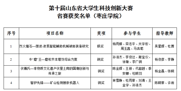 近日,在第十届山东省大学生科技创新大赛决赛中,我校参赛团队共夺得山东省银奖1项,铜奖3项,这个成绩是近年来此项赛事的新突破。
